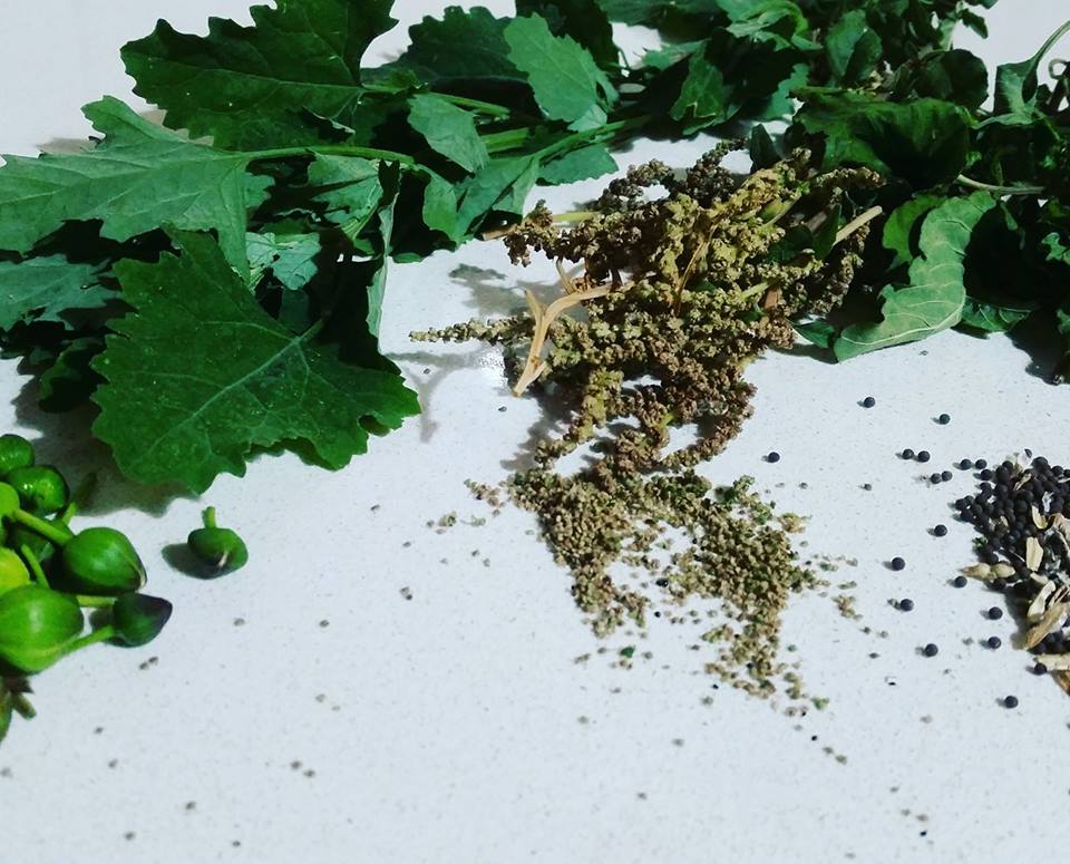 | A summer forage of capers, lambsquarter leaves, amaranth leaves and grains, and mustard seeds |